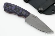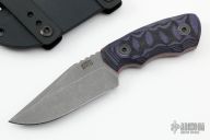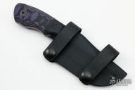 This fixed blade by Bill Coye features an acid tumble finished blade with notched thumbrest, blade thickness of .209" and blade depth of 1.302", full tang construction. Great feel in the hand. Handle has sculpted black/purple G-10 scales. Comes with kydex sheath. Comes with original papers and COA. Excellent condition.