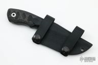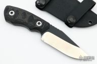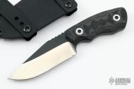This fixed blade by Bill Coye features a two-tone blade with notched thumbrest, blade thickness of .222" and blade depth of 1.290", full tang construction. Great feel in the hand. Handle has sculpted black G-10 and carbon fiber scales. Comes with kydex sheath. Comes with original papers and COA. Excellent condition.