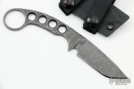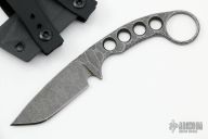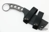 This Klaaw from Compliance Edge Knives features a tumble finished drop point blade. The handle is comprised of a textured, tumbled and skeletonized integral construction with a 1" finger ring on the pommel. Includes kydex sheath. Excellent condition.