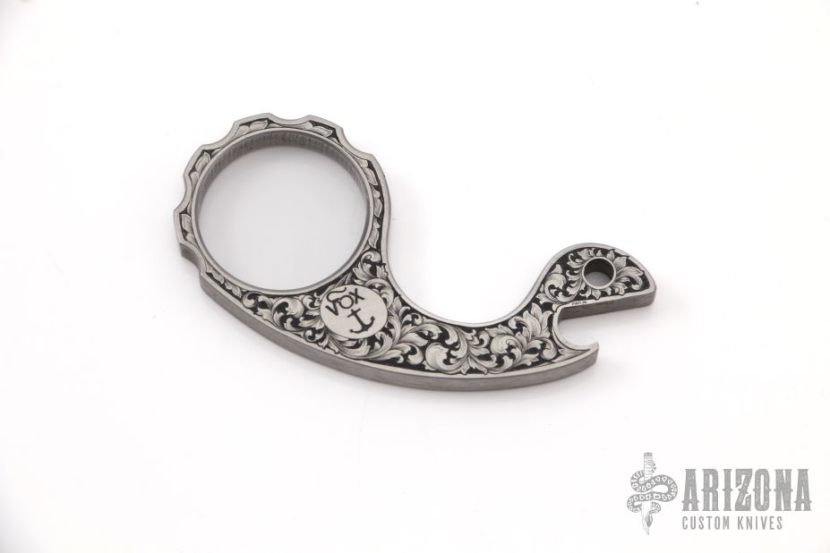 This Snail by Vox Knives is made from satin finished titanium and is .234" thick. One side has been engraved by Panja Pojiew. Comes with COA from Panja dated March 10, 2015. Has a couple light scratches, otherwise excellent condition.