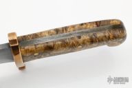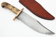 This bowie by Swamp Fox features a hand forged blade with a hand rub satin finish and light bluing, .241" blade stock and 2.345" blade depth, full tang construction. The handle has a brass guard  with maple burl scales and brass pins. Comes with brown leather sheath made by Schrap Leather. Has a few light scratches, otherwise excellent condition.