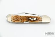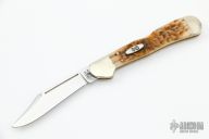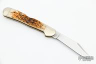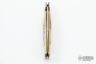 This Mini Copperlock by Case Knives has been converted to a dual action automatic by Tank Fisher. It features a polished clip point blade with swedge and long pull. The handle is comprised of nickel silver double bolsters and jigged bone scales with nickel silver push button over brass liners and a fileworked stainless steel lockbar. Has some light scratches, otherwise excellent condition.