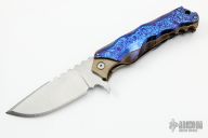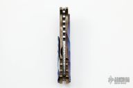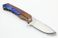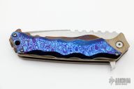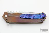 This frame lock flipper by Phantom Steelworks features a satin finish blade with notched thumbrest and a flipper, flats and spine have been textured. Anodized and textured titanium frame with timascus overlay on front side of frame. Timascus tip up carry pocket clip. Flipper that requires no wrist action. Strong lock up, and nice detent and blade seating. Nice Work. Comes with nylon zippered case. Excellent Condition.