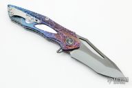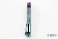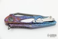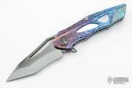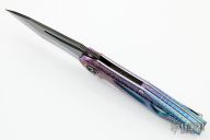 This Noah Flipper from Dew Hara features a black DLC mirror polished blade with notched thumbrest and flipper. The handle has laser engraved titanium scales with mother of pearl inlays, textured stainless steel liners and a laser engraved titanium backspacer. Skeletonized stainless steel tip up clip is positioned for right hand carry. Includes velcro cloth pouch. 3 of 5 on clip. Nice detent and lockup, rides on bearings. Excellent condition.