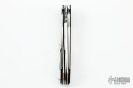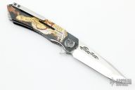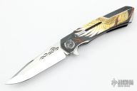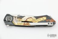 This Mina by Dew Hara features a mirror polished blade with notched thumbrest and flipper. The handle has a copper/titanium frame with stainless steel liners with matching tip up clip. 1 of 1. Comes with a velcro pouch. Excellent condition.