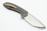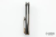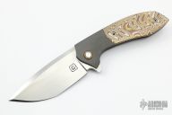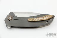This Catalyst V from Tuff Knives features a hand rub satin finished blade with swedge and flipper. The handle is comprised of a tumbled titanium frame with a mokume scale, backspacer, pivot collars and tip up clip with hidden screws. Nice blade seating, detent and lock up. Has a few light scuffs on the bead blasted finishes, otherwise excellent condition.