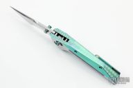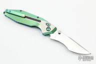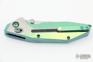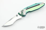 This Banshee by Will Moon features a mirror polished blade with dual thumbstuds. The handle is composed of a two tone titanium frame with a matching tip up pocket clip with a ceramic ball, shard carbon fiber inserts, jeweled spine. This knife features Will Moon's patented spindle lock. Nice blade seating. Has some light scratches, otherwise excellent condition.