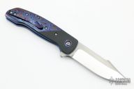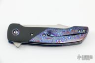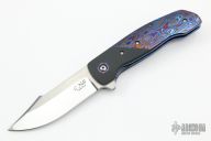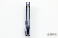 This ESG Linerlock flipper by Chad Nell has a mirror finished blade with false top edge and notched flipper. Handle has zirconium bolsters, ZircuTi scales, pivot collars, floating backspacer and tip up clip, anodized titanium liners. Rides on bearings, nice detent, lockup and blade seating. Has a few light scuffs, otherwise excellent condition.