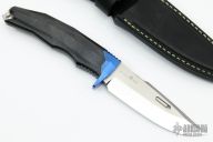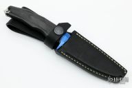 The RITSU-ZDP is a modern, compact fixed blade by Rockstead Knives in Japan. It features a full tang 3.875" ZDP-189 dual convex Honzukuri blade with a mirror finish. The lightweight wood Micarta handles are accented with a blue titanium guard. The index finger guard and jimping on the spine give the user a solid, secure grip. The exceptional mirror finish is achieved by heat treating the blade and gradually hand grinding through 400, 600, 800, 1200 and 2000 grit wet-dry sandpaper. This is very intense and time-consuming because if any scratches were to occur during this process, the blade must be sent back to the previous step for refinishing. Once this is complete, the blade will be buffed for the final finish. The folks at Rockstead have mastered this process to give the knife a beautiful finish and sharp edge like no other. Each knife is individually numbered and includes a certificate of authenticity. Includes Japanese-style cloth bag.