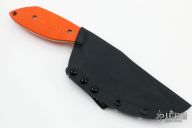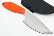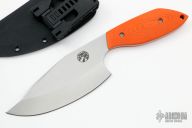 This Trash Panda fixed blade by Aaron Frederick features a stonewashed blade with a false top edge, .168" blade stock and 2.271" blade depth, full tang construction. The handle has orange G-10 scales and a lanyard hole, comes with a kydex sheath with a TekLok. Excellent condition.