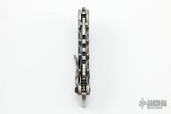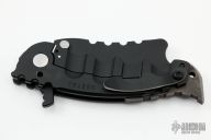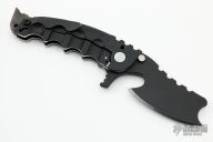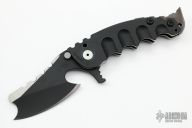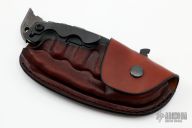 This Man of War flipper by TS Heeter features a black blade with notched thumbrest and flipper. The handle has a black titanium frame with tip up reversible titanium clip, black oxide finished 3V steel backspacer. Comes with a custom brown leather belt sheath. Nice detent, lockup and blade seating. Excellent condition.
