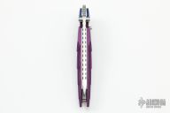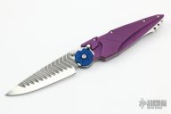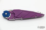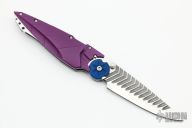 The Kabuto is a custom button lock folder by Dew Hara. He is the son of legendary Japanese knifemaker, Koji Hara and is about to embark on a four year apprenticeship with another well-known custom knifemaker, Anthony Marfione. The Kabuto is a push button folder that locks both in the opened and closed positions, and the blade can be easily and instantly deployed by flicking your wrist while pushing down the button. The mirror polished blade features unique lightning wavy grooves to give it an aggressive look. The handle has violet aluminum scales with stainless liners and backspacer. The design of this knife is to resemble the helmet first used by ancient Japanese warriors, and in later periods, they became an important part of the traditional Japanese armor worn by the samurai class and their retainers in feudal Japan. Has a couple light scuffs, otherwise excellent condition.