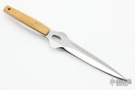 This knife by Rod Chappel features a mirror polished  blade. .356" blade stock and 1.104" blade depth, tapered tang construction. The handle features micarta scales.  Includes a padded zippered case. S/N 001. This knife is one of two.  Excellent Condition.