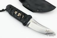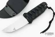 This Wasabi by RJ Martin features a satin finished chisel ground tanto blade, .250" blade stock and 1.252" blade depth, hidden tang construction. The handle has black cord wrap over black stingray skin. Comes with a leather wrapped kydex sheath with mole skin lining. Light oxidation is visible on the blade otherwise the knife is in excellent condition.  Excellent condition.