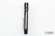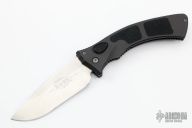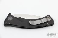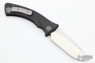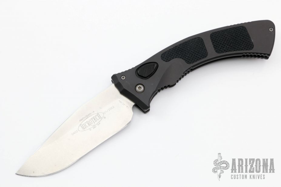 This Amphibian automatic by Microtech Knives has a stonewashed blade with notched thumbramp. The handle is comprised of black aluminum with non-slip inlays, stainless steel clip positioned for tip down carry, and lanyard hole at the pommel. Serial number 0402 and dated 01/2002. Has some scuffs, a ding on the corner of the frame, has been resharpened, otherwise good condition.