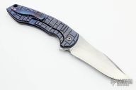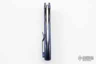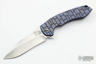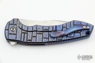 This framelock flipper by Rick Lala features a hand rub satin finished blade with notched thumbrest and flipper. The handle features a hand carved and anodized titanium frame, notched titanium backspacer, tip up titanium clip. Includes Dual Row IKBS (Ikoma-Korth Bearing System) for smooth and fast opening that requires no wrist action. Nice blade seating, detent, and lockup. Outstanding work with great attention to detail.  Comes with zippered case. Excellent condition.