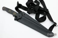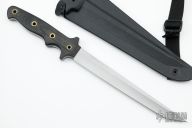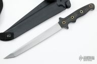 This Vorpal 1-C by Tom Maringer features a bead blast finished tanto blade with notched thumb and finger rests, full tang construction, .265" Blade Stock, 1.038" Blade Depth. The handle has green linen micarta scales. Includes a kydex sheath with shoulder harness. Excellent condition.