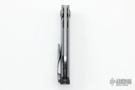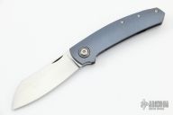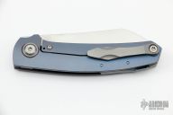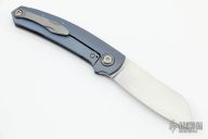 This Haddock Framelock by Jens Anso features a hand rub satin finished blade with nail nick. The handle has an intricately milled and anodized titanium frame with a stonewashed titanium tip up clip and backspacer with lanyard hole, satin titanium hardware. Nice detent, lockup and blade seating. Comes with custom padded pouch (By SoMMER). Excellent condition.