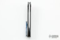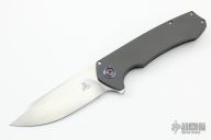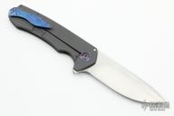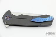 This Typhos flipper by Walter Randolph features a hand rubbed satin finished blade with false top edge and notched flipper. The handle has a bead blasted titanium frame with MokuTi pivot collars, floating backspacer, and tip up clip. Nice detent, lockup and blade seating. Rides on bearings, nice detent, lockup and blade seating. Comes with a zippered case. Excellent condition.
