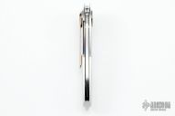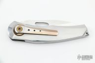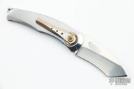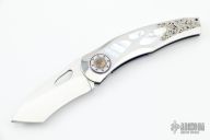 This stunning linerlock from Michael Henningsson, one of the makers to watch from Sweden. Awarded "Best Swedish Knife of 2011" at the Swedish Knife Guild awards. The knife has a hand rub satin finished tanto recurve style blade with a thumbhole. The handle has a satin finished stainless steel frame with polished chamfers, mother of pearl inlays and a tip down two-tone stainless steel clip. The handle has been engraved and inlaid with gold. Nice lockup, detent, and seating. Comes with original box. Has a few light scratches, otherwise excellent condition.