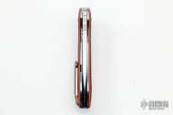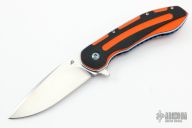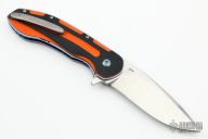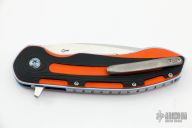This Kempachi by JD Van Deventer features a hand rubbed satin finished blade with mirror polished flats, notched thumbrest and flipper. The handle has black G-10 over orange G-10 scales, anodized titanium liners with jeweled interiors, notched titanium backspacer and a stonewashed titanium tip up clip. Lanyard pin at the butt. Comes with velcro case. Rides on IKBS, nice detent, lockup and blade seating. Has a few light scratches, otherwise excellent condition.