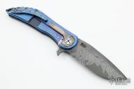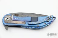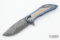 This AOD (Absence of Doubt) from Darrel Ralph features a San Mai Damascus blade with swedge, notched thumbrest and flipper. The handle a ZircuTi and anodized titanium frame with mammoth tooth inlays, MokuTi backspacer and tip up clip. Has a stainless steel lockface insert and overtravel stop. Nice blade seating, detent and lock up. Rides on bearings. Comes with a zippered case. Excellent condition.