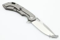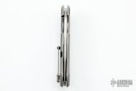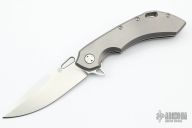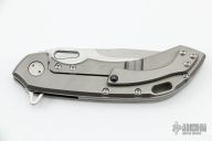 This Wayfarer 247 from Olamic Cutlery features a satin finished blade with swedge, thumbhole, notched thumb rest and flipper. The titanium handle scales are bead blast finished titanium with a matching pocket clip is positioned for tip up carry with a ceramic ball inlay, floating titanium backspacer. The Wayfarer 247 is very comfortable in the hand and flips well with no wrist action needed. Blade is centered when closed and locks up with no play. Comes with zippered case and maker's card with a serial number of T1626 and dated 9-1-21. Excellent condition.