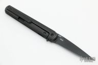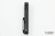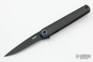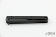Handle: A simple, tapered and contoured handle is formed from two slabs of solid, black titanium with a partial stainless steel back spacer for balance. Secure in the grip thanks to the distal taper, the handle is quite comfortable in multiple grip positions. Integral to the back slab, the frame lock mechanism is equipped with a steel lock face insert for smooth, reliable operation and rock solid lock up for the life of the knife. Slotted screw construction and a blue anodized pivot ring round out the construction.