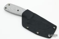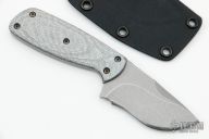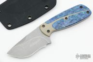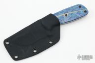 This Knife by Neil Blackwood features a stonewashed blade with a notched thumb rest and a full tang construction, .149" blade stock and 1.325" blade depth. The handle has a tan G-10 scale with acrylic inlay, the other scale is silver twill with a blue liner. Comes with kydex sheath. Excellent Condition.