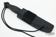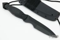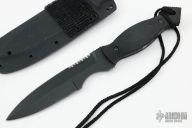 This Bud Nealy PTK (Pick Tactical Knife) is double edged, partially serrated and has full tang construction. This is one of the special run of one hundred sterile PTK's that ends the production of this knife by Bud Nealy. This version is the same as the version issued to Special Ops and has only a serial number 030 engraved on it. It features a black powder-coated ATS-34 blade and a sculpted black G-10 handle with deep finger grooves on tang and handle. Steel thickness is .190" with 1.330" blade depth, lower cutting edge is 5 ”, overall length 10 5/8”. The ambidextrous kydex sheath is wrapped in Dual-Lock™. Has some light sheath marks, excellent condition.