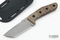 This Free Radical by Shane Sibert features a bead blast finished blade blade with false top edge and notched thumbrest, .188" blade stock and 1.519" blade depth, full tang construction. The handle has green canvas micarta scales with hollow tube pins. Comes with a kydex sheath. Excellent condition.