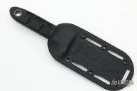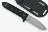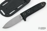 This knife from Shane Sibert  features a bead blasted blade with .127" blade stock and .940" blade depth, partial full tang construction. The handle is black G-10. Comes with a kydex sheath. Has some light sheath scuffs, otherwise excellent condition.
