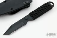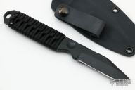This Knife from Wilson Tactical features a black tanto partially serrated blade with notched thumbrest, .192" blade stock and .923" blade depth, full tang construction with black paracord wrapped grip, lanyard hole at the butt. Comes with kydex sheath. Excellent condition.