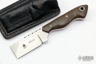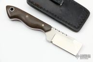 This Razel by Graham Knives features a satin finished blade with a fileworked spine, .196" blade thickness and .997" blade depth, full tang construction. The handle has green linen micarta scales with mosaic pins and a lanyard hole. The Razel features a sharpened front edge and is a tremendously useful and versatile EDC knife. Comes with a custom leather sheath with pocket clip. Knife is in excellent condition.