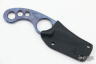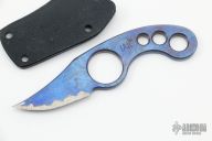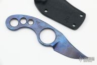 This Perrin La Griffe by Warren Thomas  is "Fingerprint" anodized titanium with a chisel ground blade with a carbide edge, .202" thickness and 1.087" blade depth, 1" diameter finger hole. Nice fit in the hand. Has some scratches, otherwise good condition. Comes with kydex sheath.