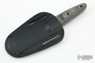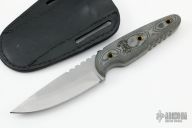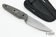 This knife by Tops features a bead blasted blade with a visible temper line and notched thumbrest, .177" blade stock and 1.271" blade depth, full tang construction. The handle has black linen micarta scales with white liners. Comes with a black leather sheath. Excellent condition.