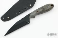 This knife by Tops features a black blade with a notched thumbrest, .267" blade stock and 1.171" blade depth, full tang construction. The handle has black linen micarta scales with red liners. Comes with a kydex sheath. Excellent condition.