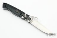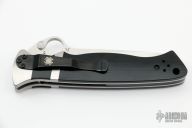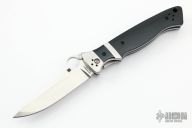 This Vallotton Sub-Hilt Auto by Spyderco was converted by Butch Vallotton, it features a satin finished S30V blade with a thumb-hole, dual thumb-studs, and notched thumb-rest. The handle has stainless steel bolsters, black G-10 scales, stainless steel liners, black G-10 backspacer, and 4-way reversible black stainless steel clip. Nice detent, lockup and blade seating. Has a few scratches, otherwise excellent condition.  #113