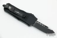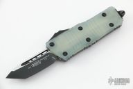 This Troodon Mini OTF automatic by Microtech knives features a black finished tanto blade with satin finished flats. The handle has a jade green G-10 top, black aluminum frame with black hardware, tip down carry. Glass breaker. S/N 085. Dated LVCKS 2022. Comes with original box and papers. Excellent condition.