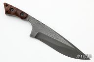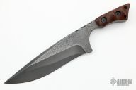 This custom fixed blade by Mick Strider features a darkened blade with hamon and hammermarked flats, notched thumbrest, .327" blade stock and 1.794" blade depth, full tang construction with brown canvas micarta scales. Coems with a velcro case. Excellent condition.