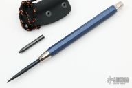 This spike pen features a black oxide finished spike that is deployed by pressing the button at the rear of the pen. This pen has been internally modified to accept and eject the spike with the push of the rear button. A piece of pencil graphite is positioned at the tip to conceal the spike. Works as a functioning pencil. New from maker. Very clever. Comes with a kydex neck sheath.