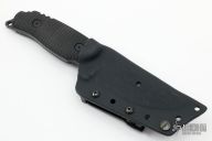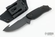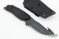 This Guthook Hunter by Strider features a black blade with notched thumbrest and guthook, .195" blade stock and 1.227" blade depth, full tang construction with black G-10 scales. Coems with a kydex sheath with TekLok. Has some suffs on the blade, otherwise excellent condition.