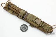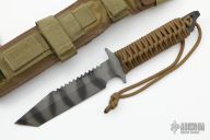 This BTSS from Mick Strider features a tiger stripe clip point tanto style blade with serrations on the spine, .249" blade stock and 1.296" blade depth. The handle is comprised of tan paracord wrap over full tang construction with a lanyard hole. Includes nylon sheath with belt loop. Comes with challenge coin with matching #. Excellent condition.