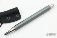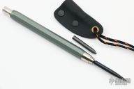 This spike pen features a black oxide finished spike that is deployed by pressing the button at the rear of the pen. This pen has been internally modified to accept and eject the spike with the push of the rear button. A piece of pencil graphite is positioned at the tip to conceal the spike. Works as a functioning pencil. New from maker. Very clever. Comes with a kydex neck sheath.