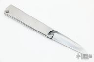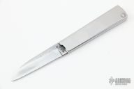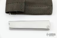This Tri-Folder by Fred Perrin features a sheepsfoot style blade. The handle is two pieces of stainless steel the the blade folds into. Has a few light scratches, otherwise excellent condition. Comes with a nylon belt sheath.