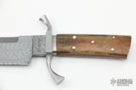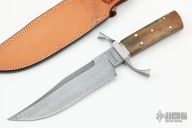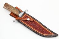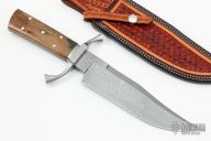 This Bowie by ABS Apprentice Kevin Burgess features a 4-Bar Turkish Twist Damascus blade with a sharpened top edge, .276" blade stock and 1.842" blade depth, hidden/mortise tang construction. The handle has satin finished 416 stainless steel guard with a stainless steel collar, two piece mammoth ivory grip with sterling silver pins. Comes with a beautiful hand tooled brown leather sheath. New from maker. Comes with a zippered case and COA.