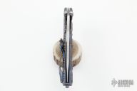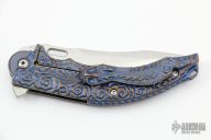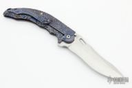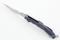 This Anaconda framelock flipper #005 by Korth Cutlery features a hand rubbed satin finish blade with thumbhole and flipper. The blade has been engraved with Japanese characters as well. The handle features exquisitely carved and anodized titanium frame, carved and anodized titanium backspacer that is carved with eyes inside the handle, carved titanium clip, tip up carry. Includes IKBS (Ikoma-Korth Bearing System) for smooth and fast opening that requires no wrist action. Perfect blade seating, detent, and lockup. Outstanding work with great attention to detail.  #005 on the back of the blade. Comes with a Velcro case. Excellent condition.