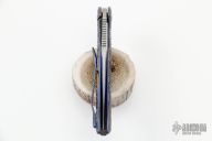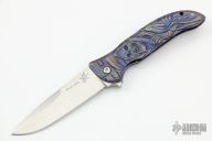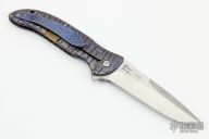 This Stinger framelock flipper by Korth Cutlery features a satin finish blade with notched thumbrest and flipper. The handle has a carved titanium frame with grim reaper motif, carved titanium clip, black G-10 backspacer. Numbered 110. Includes IKBS (Ikoma-Korth Bearing System) for super smooth and fast opening. Nice blade seating, detent, and lockup. Excellent condition.