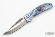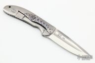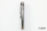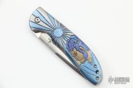 The most distinctive feature of this knife is the deep fullers on each side of the blade and the raised and checkered thumb opening. The handle has a carved and anodized titanium front scale, orange peel finished titanium frame side, carved titanium tip down clip, green/tan G-10 backspacer. The dual thumb ramps are an integral part of the blade and have been checkered on each side to allow for ambidextrous opening. This knife incorporates the Ikoma Korth Bearing System (IKBS) which further enhances the smooth, fast and solid opening and lockup. Serial #050. Excellent condition.