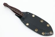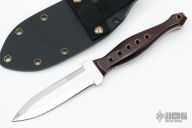 This dagger from Martin Knives features a mirror polished double edge blade with .119" blade stock and 1.035" blade depth, full tang construction. The handle is comprised of maroon linen micarta scales over black liners, brass tubes and lanyard tube in pommel. Has some light scratches, otherwise excellent condition. Comes with a kydex sheath.